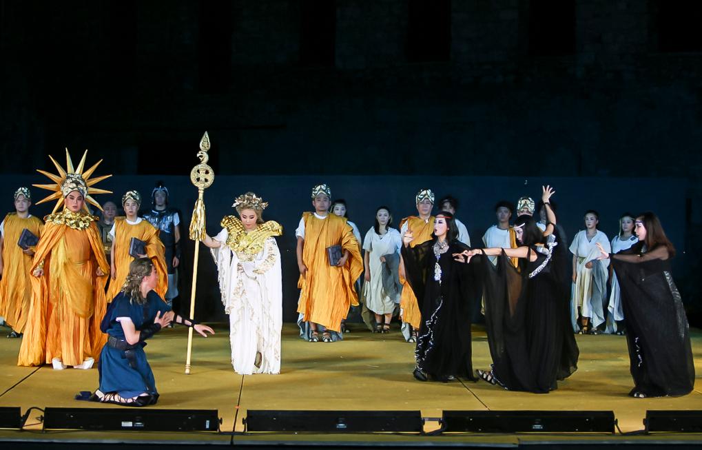 2015年7月29日晚,在希臘埃萊夫西納市埃斯庫羅斯戲劇節上,羅錦鱗導演的評劇《城邦恩仇》演出劇照。新華社記者 劉詠秋 攝