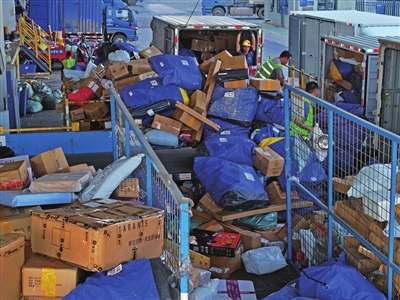 圖為今年“雙十一”期間工人在位于廣西南寧市五象新區的一家快遞轉運中心裝卸包裹(無人機照片)。 記者 周華 攝