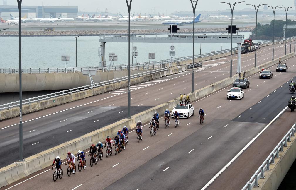 11月24日,參賽選手在港珠澳大橋香港段騎行。新華社發(盧炳輝攝)