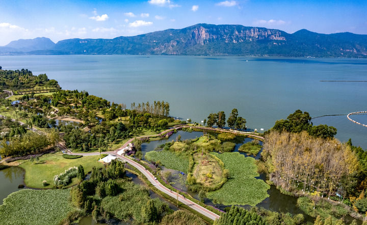 這是2024年10月18日拍攝的云南省昆明市滇池及星海半島濕地公園(無人機照片)。 新華社記者 陳欣波 攝