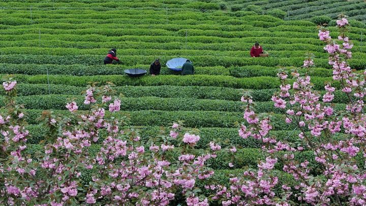 2024年4月6日,村民在貴州省遵義市鳳岡縣永安鎮田壩社區茶葉基地采摘春茶(無人機照片)。新華社發(王超 攝)
