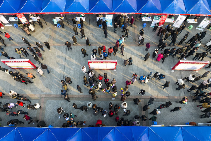 2023年1月31日,在四川省閬中市人民廣場,求職者參加東西部勞務協作暨春風行動大型招聘會(無人機照片)。 新華社發(王玉貴 攝)