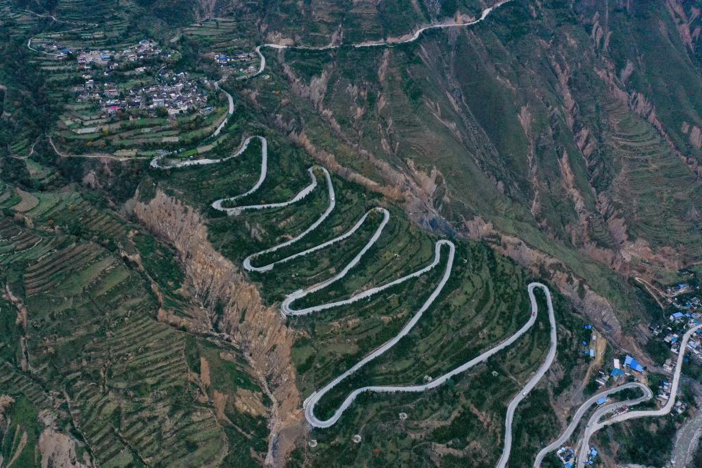 這是高樓山路段“十二道拐”一景(無人機照片)。(李董 攝)