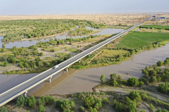 民豐縣境內的尼雅河特大橋上,列車呼嘯而過,成為沙海里一道亮眼的風景。