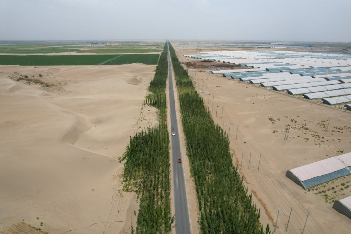 這是在新疆和田地區和田縣拍攝的防護林帶,道路兩邊是沙漠飼草基地和設施農業基地(2024年6月20日攝,無人機照片)。新華社記者 丁磊 攝