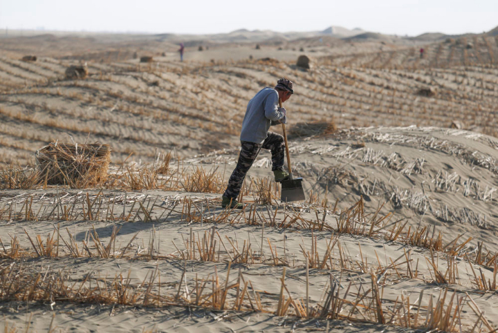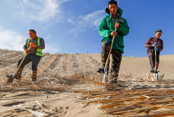 工人在新疆和田地區民豐縣后河壩沙漠阻擊區補扎草方格(2024年12月3日攝)。新華社記者 王菲 攝