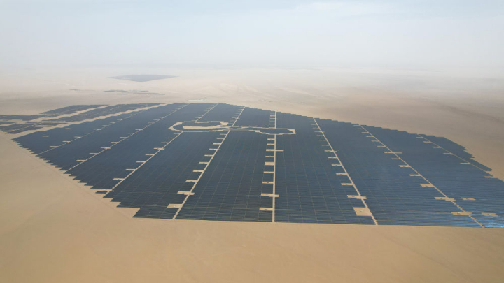 這是在新疆和田地區光伏產業園拍攝的“沙戈荒”光伏項目(2024年6月20日攝,無人機照片)。新華社記者 丁磊 攝