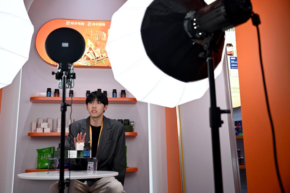 2024年11月5日,快手跨境主播在第七屆進博會服務貿易展區直播。新華社發(陳浩明攝)
