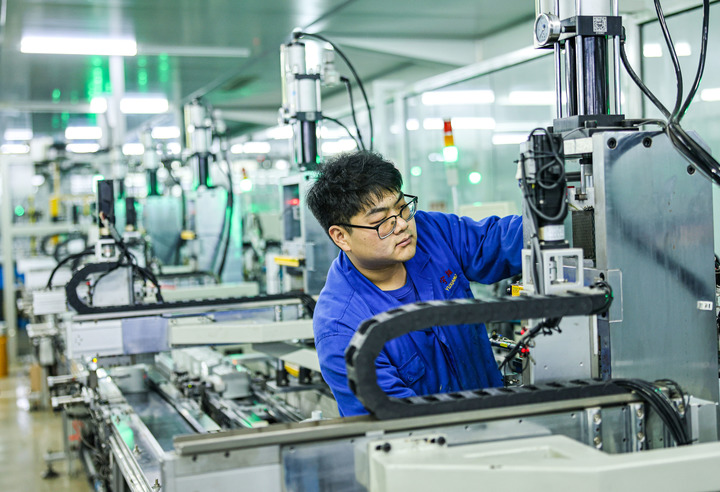 2024年12月12日,在山東省榮成市一家燃氣計量儀表制造企業的智能化生產車間內,維修工人在進行設備調試。新華社發(李信君攝)