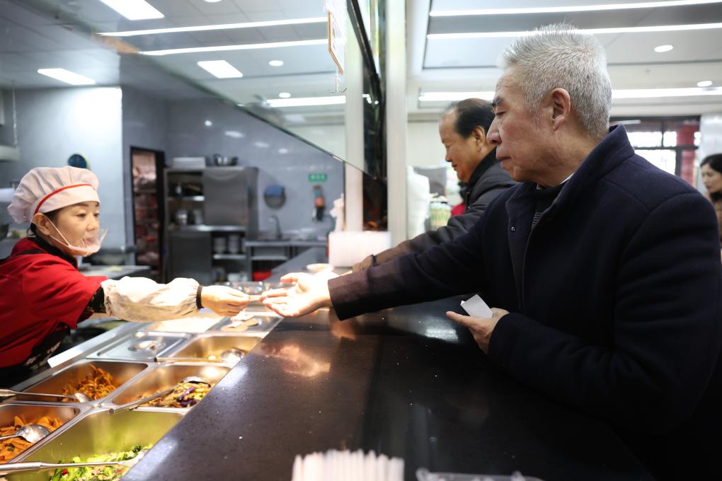 11月22日,在華亭市東華鎮東華綜合養老服務中心,老人在餐廳窗口打飯。新華社記者 陳斌 攝