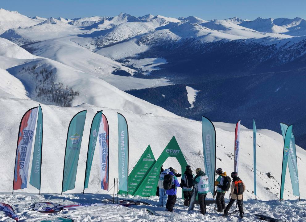 12月4日,世界野雪巡回賽新疆禾木站工作人員在禾木吉克普林國際滑雪度假區勘查比賽場地(無人機照片)。新華社記者 胡虎虎 攝