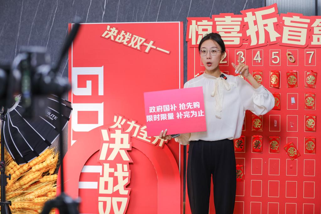 11月11日,主播在山東省青島市李滄區深廣互動直播基地內直播介紹家電“以舊換新”政策。新華社發(張鷹 攝)