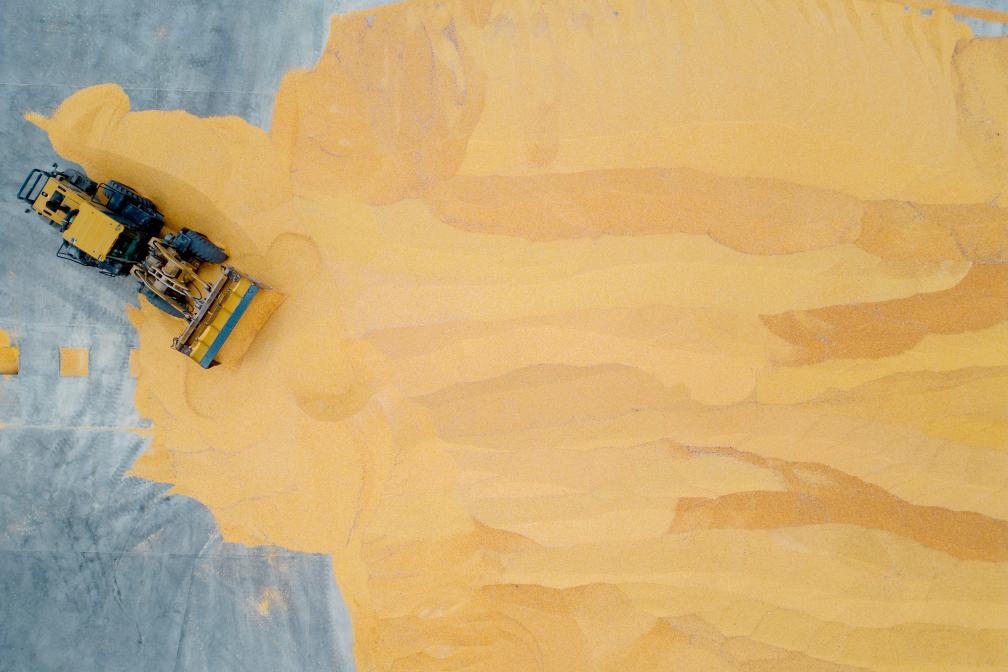 11月5日,在黑龍江省富錦市萬里利達糧食儲備有限公司內,工作人員在進行玉米分堆作業(無人機照片)。新華社記者 張濤 攝