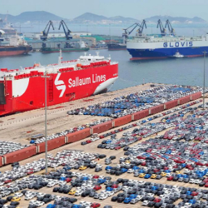 2024年8月6日,在山東港口煙臺港,滾裝船在裝運外貿車輛(無人機照片)。新華社發(唐克攝)