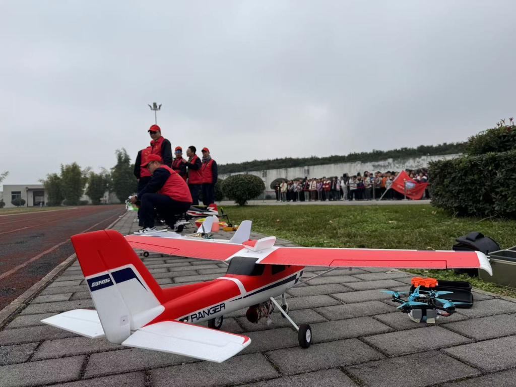 中國航空工業集團陜飛航模隊為陜飛一小師生進行航??破诊w行表演。新華社記者顧天成 攝