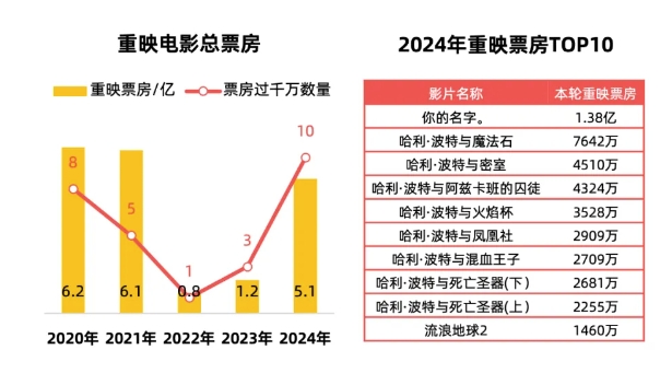 2024年,中國電影市場有十部經典老片在院線重映,所有重映影片票房均破千萬,總票房超過5億。其中,《哈利·波特》重映成績尤為亮眼,該系列連續56天躋身日榜前十名,此外,《你的名字》《海上鋼琴師》《爆裂鼓手》《這個殺手不太冷》等也評價不俗。經典老片重映勾起了觀眾的懷舊記憶,厚重的歷史感也同樣吸引了很多年輕觀眾。用創新技術讓老片子“新起來”,讓傳統經典帶動當代電影創作,也從另一方面為電影市場提振信心。
