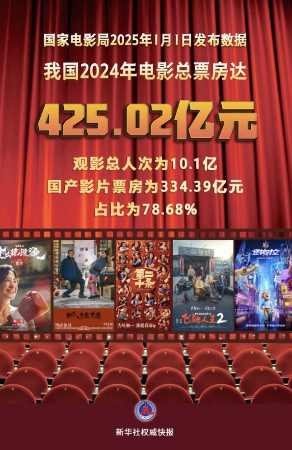 國家電影局2025年1月1日發布數據,我國2024年電影總票房達425.02億元,觀影總人次為10.1億。