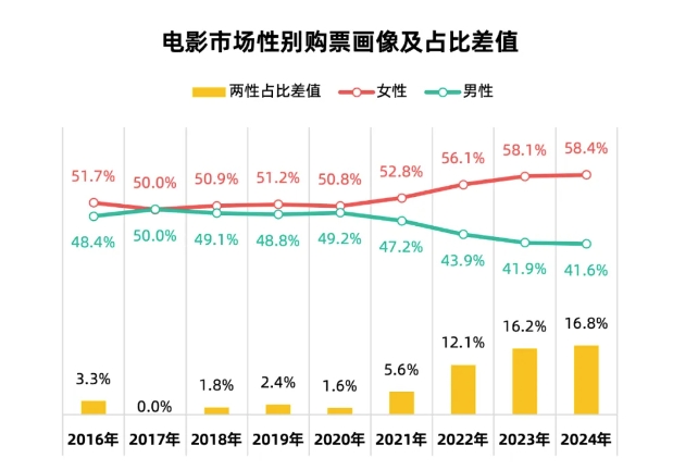 城市票房貢獻方面,三四線城市票房占比進一步提升,從2016年的不足30%至2024年的40%,可見下沉市場仍然是中國電影行業拉新的重要來源。