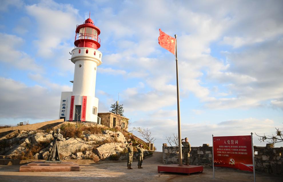 開山島守島民兵迎著朝陽舉行升旗儀式(2024年10月26日攝)。
