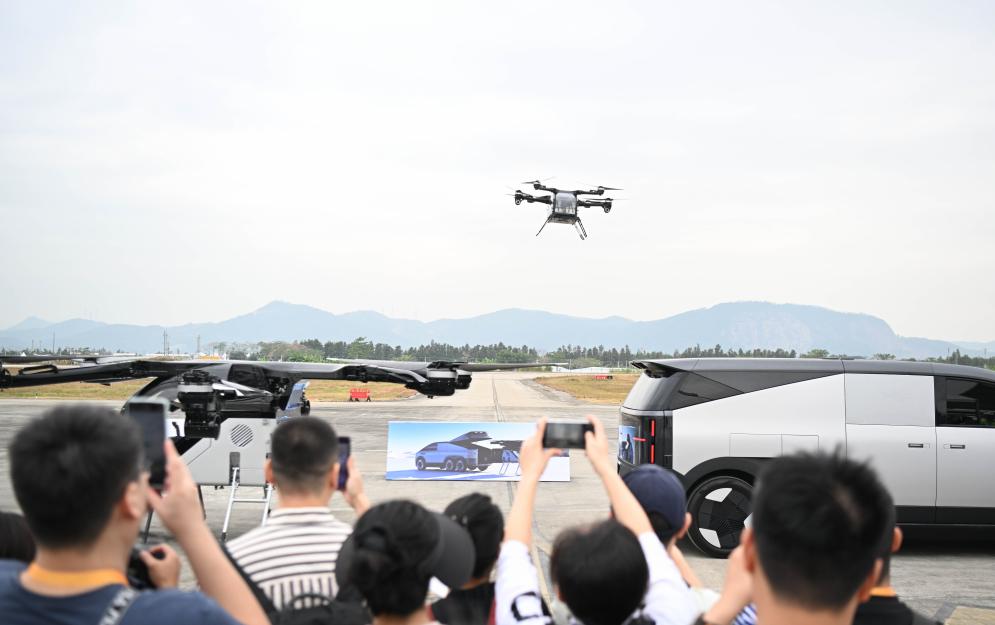 在中國航展第二展區,小鵬匯天飛行汽車“陸地航母”進行飛行演示(2024年11月10日攝)。