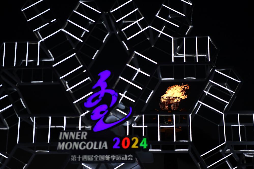 這是2024年2月27日在內蒙古冰上運動訓練中心拍攝的第十四屆全國冬季運動會主火炬。當晚,第十四屆全國冬季運動會閉幕式在內蒙古呼倫貝爾市舉行。