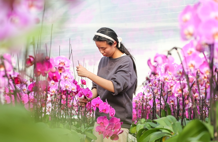 1月4日,在江蘇省鎮江句容市茅山鎮前陵村蝴蝶蘭種植基地,花農在管護花卉。新華社發(鐘學滿 攝)