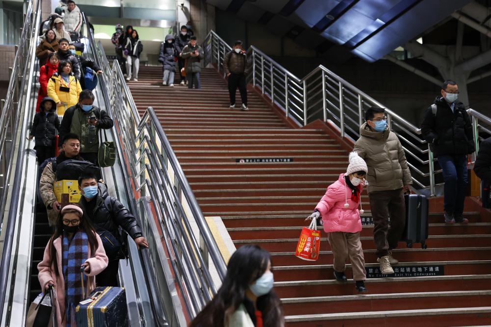 2024年1月26日,在北京西站,乘坐G511次列車返回湖北老家的錢克怡(右三)與爸爸牽手準備乘車。當日,2024年春運啟動。