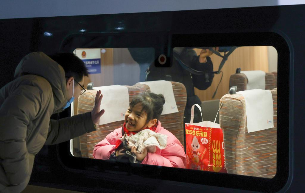 2024年1月26日,在北京西站,乘坐G511次列車返回湖北老家的錢克怡趴在車窗前與送站的爸爸告別。