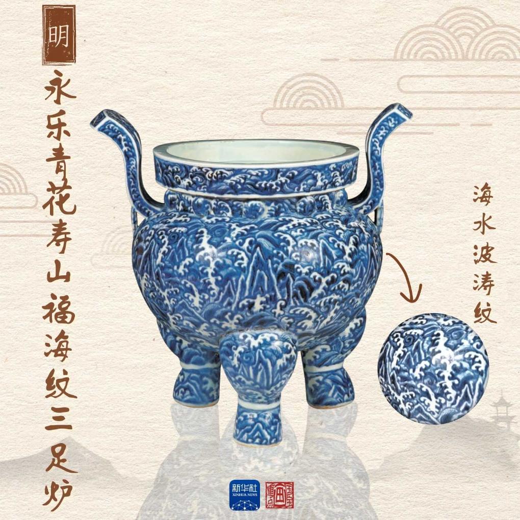 這件藏于南京博物院的永樂青花壽山福海紋三足爐,造型為青銅鼎樣式,腹部紋飾為壽山福海紋,海水波濤洶涌,氣勢宏大。
