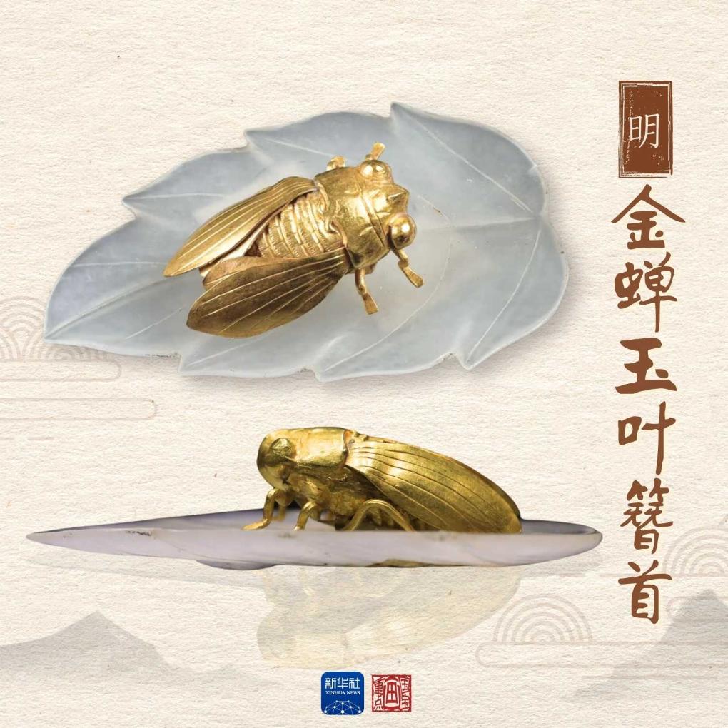 一只形神畢肖、金光閃耀的蟬,棲憩在玉葉上。它側身翹足,雙翼略張,嘴巴微開,好似在奏鳴。它從蘇州張安晚家族墓出土,據考證是女子頭上的發簪。