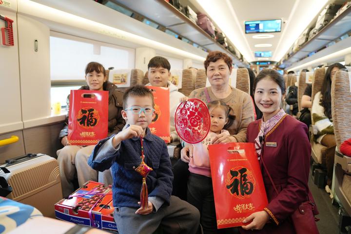 “各位旅客大家好,今天是農歷小年,祝大家吉祥如意、福氣滿滿?!绷熊囬L譚艷妮給乘車旅客送上祝福,并送上裝有春聯和福字的福袋,讓福伴旅途。