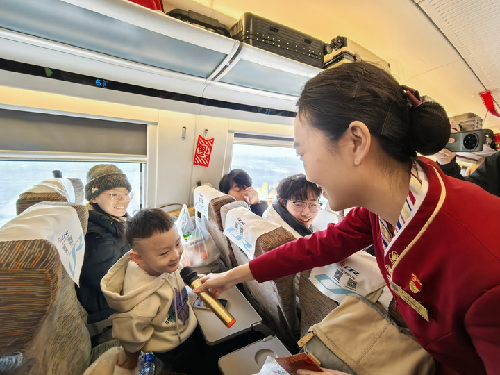 乘務人員變身“聯歡會”主持人,為乘客介紹起了天津、香港兩地的小年傳統習俗。猜燈謎、親子互動游戲……豐富多彩的節目贏得了乘客們的陣陣掌聲,車廂內一片歡聲笑語。