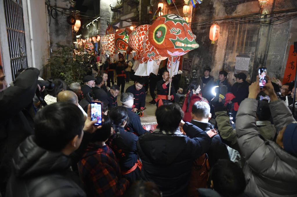 2025年1月8日晚,安徽省黃山市歙縣北岸鎮瞻淇村魚燈隊在村里表演。新華社記者 魯鵬 攝