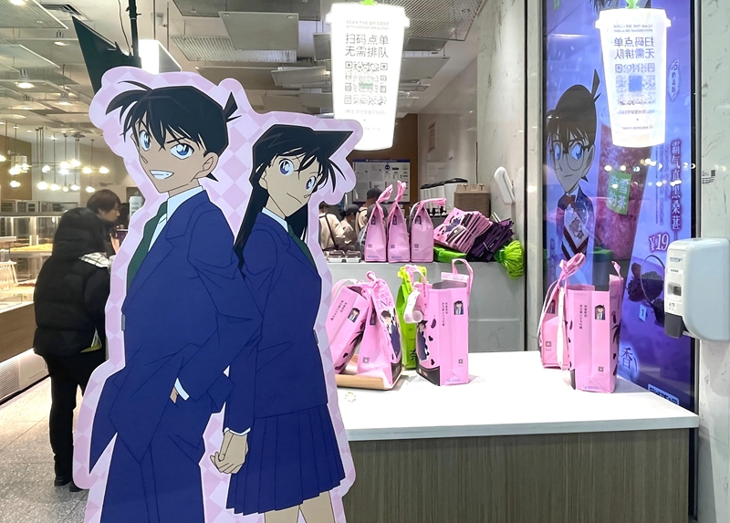 某奶茶店展示的《名偵探柯南》聯名人形立牌及飲品。新華網記者 吳寒冰 攝