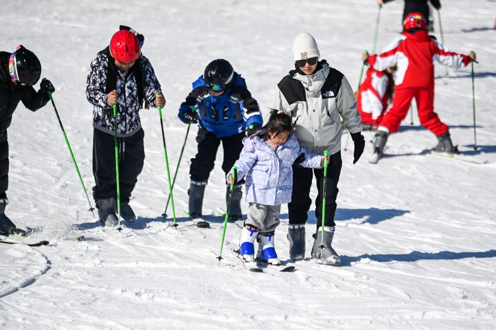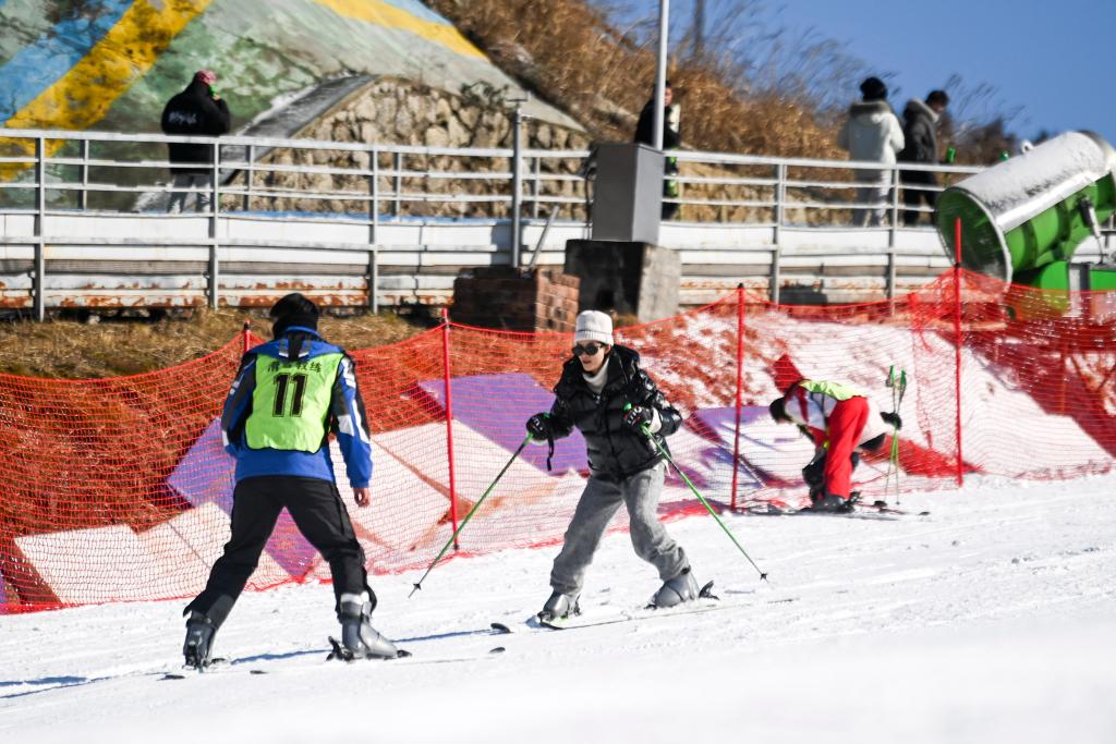 ↑游客在教練的帶領下在天湖滑雪場滑雪。