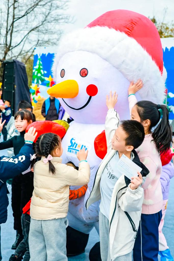 ↑小朋友們在桂林30℃雪域嘉年華(堯山站)與雪人玩偶互動。