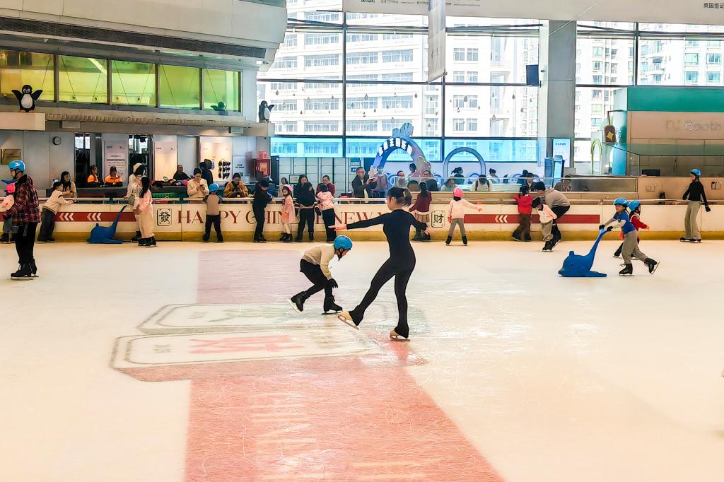 ↑在廣西南寧市一家室內冰場,市民們在滑冰。
