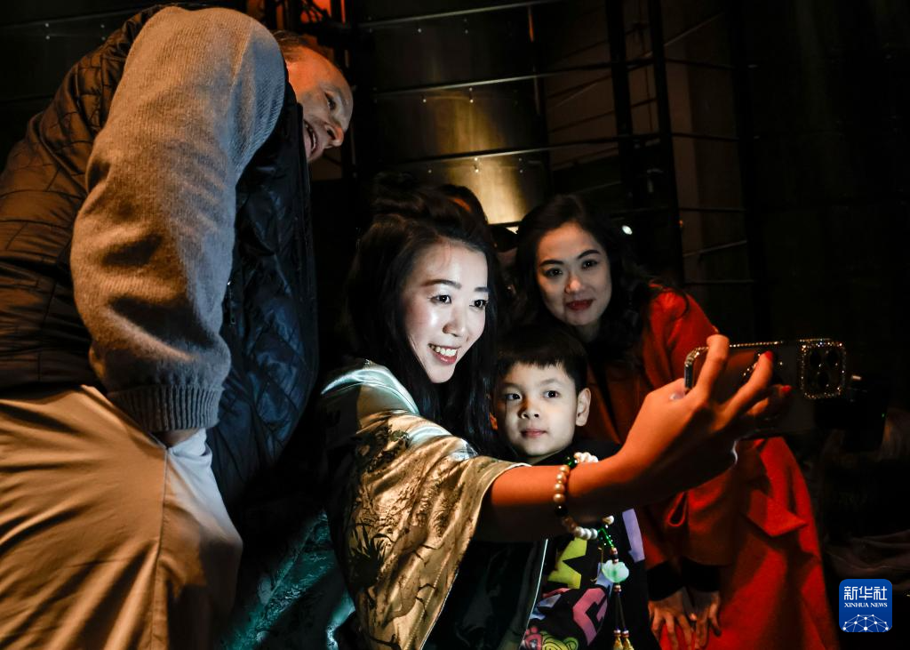2月1日,在美國芝加哥,觀眾在“歡樂春節”演出中自拍。新華社發(喬爾·萊納攝)