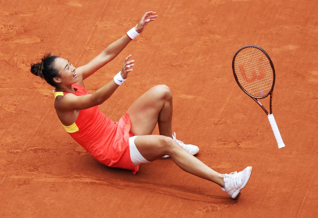 2024年8月3日,中國選手鄭欽文在巴黎奧運會網球女子單打金牌賽后慶祝奪冠。