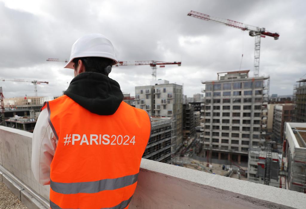 2023年3月24日,媒體記者在位于法國巴黎北郊圣但尼的巴黎2024年奧運會和殘奧會運動員村建筑工地參觀。