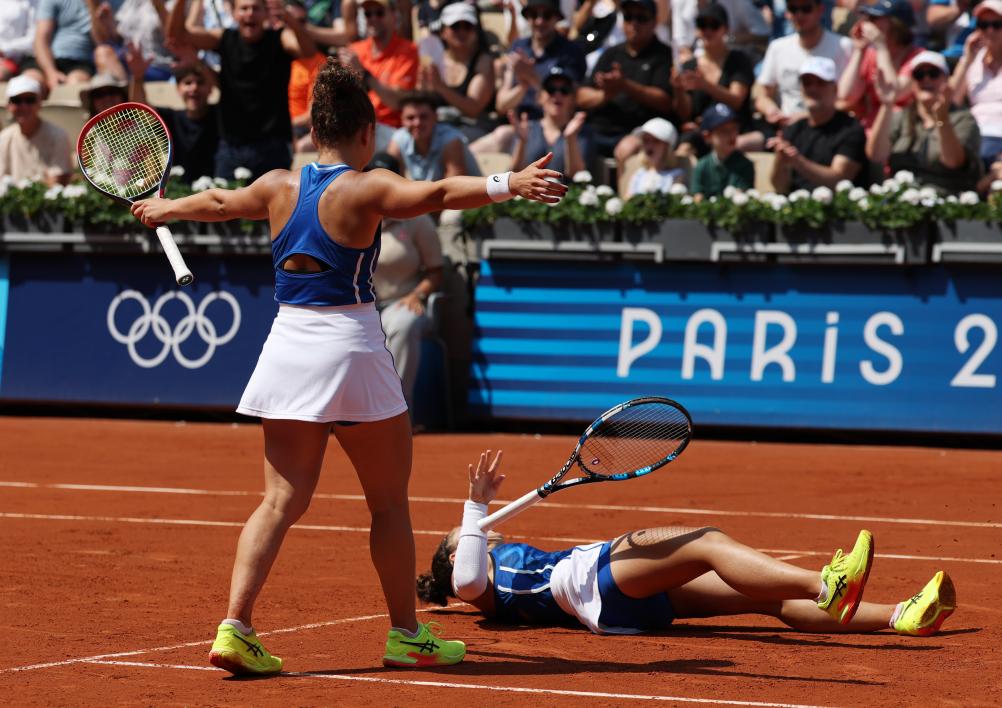 2024年8月2日,意大利組合埃拉尼/保利尼慶祝勝利。當日,在巴黎奧運會網球女雙半決賽中,意大利組合埃拉尼/保利尼2比0戰勝捷克組合穆霍娃/諾斯科娃,挺進決賽。