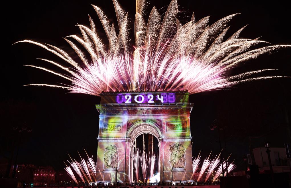 2024年1月1日,法國巴黎凱旋門上空焰火綻放,迎接新年到來。