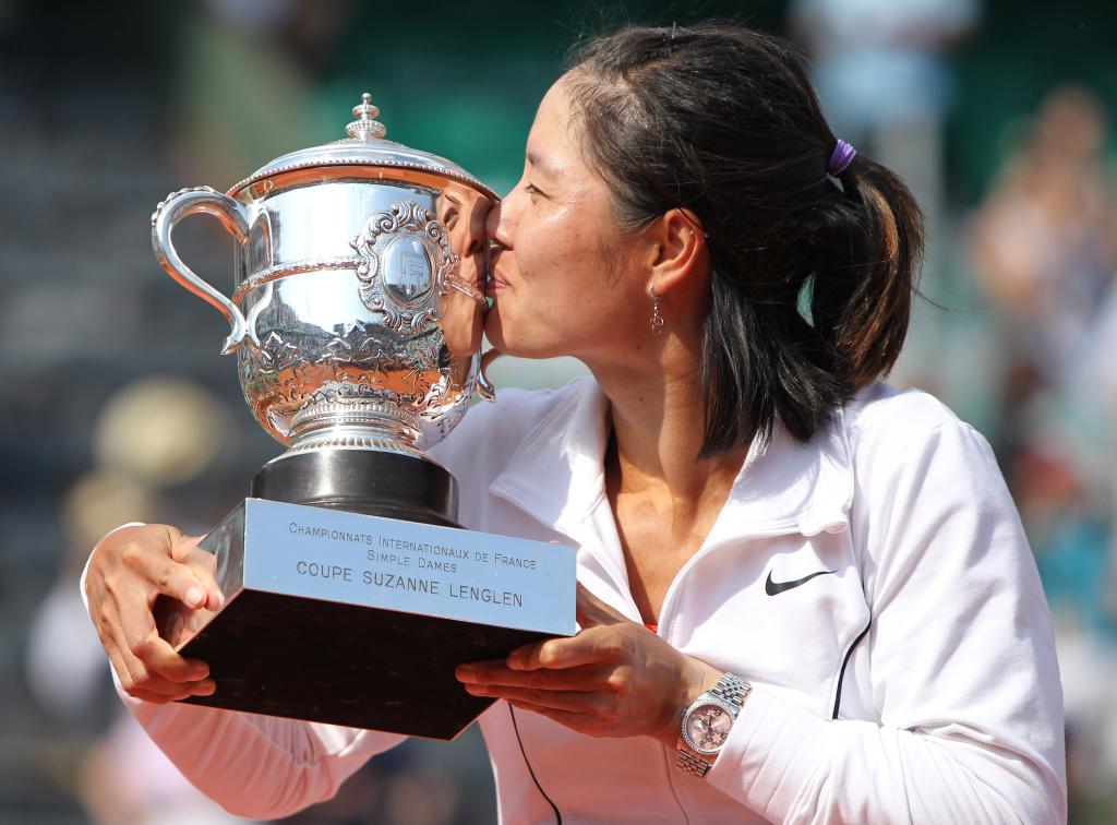 2011年6月4日,李娜在頒獎儀式上親吻獎杯。當日,在2011年法網女單決賽中,中國選手李娜以2比0戰勝意大利選手斯齊亞沃尼,奪得冠軍。這是亞洲選手第一次奪得大滿貫賽單打冠軍。