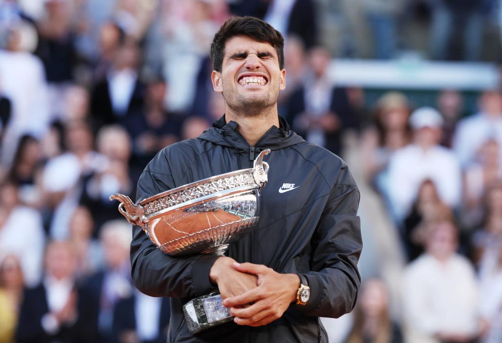 這是2024年6月9日,阿爾卡拉斯在頒獎儀式上慶祝。當日,在2024法國網球公開賽男子單打決賽中,西班牙選手阿爾卡拉斯3比2戰勝德國選手茲維列夫,獲得冠軍。