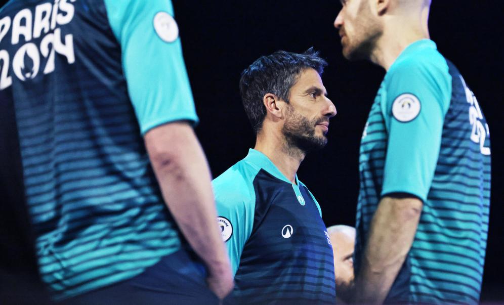 2024年3月23日,巴黎奧組委主席托尼·埃斯坦蓋(中)身著志愿者制服出席巴黎奧運會志愿者大會。當日,巴黎奧運會志愿者大會在法國巴黎附近楠泰爾的拉德芳斯體育館舉行,巴黎奧運會志愿者制服在會上正式亮相。