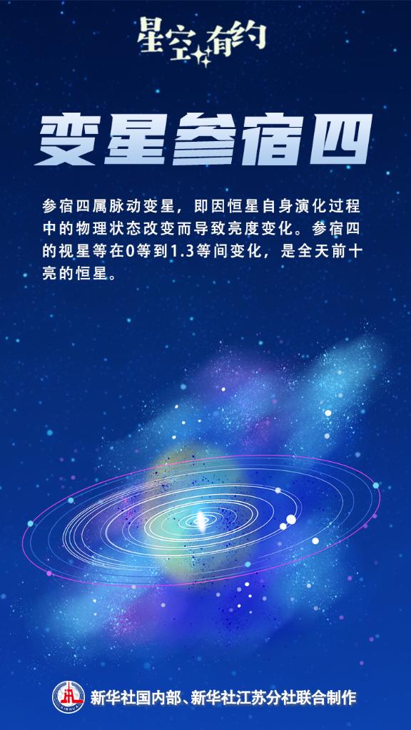 除了爆炸,參宿四身上還有不少有趣的知識點值得了解。比如,它的直徑很大,約為太陽直徑的幾百倍。另外,參宿四也是全天前十亮的恒星之一?!爸哉f參宿四亮度位居前十而沒有具體的排位,是因為它是一顆變星,視星等在0等到1.3等間變化,亮度變化周期存在一個416天的短周期和2000多天的長周期,這也是它時明時暗的原因?!蓖蹩瞥f,目前,參宿四的亮度在0.5等左右。它屬脈動變星,即因恒星自身演化過程中的物理狀態改變而導致亮度變化。