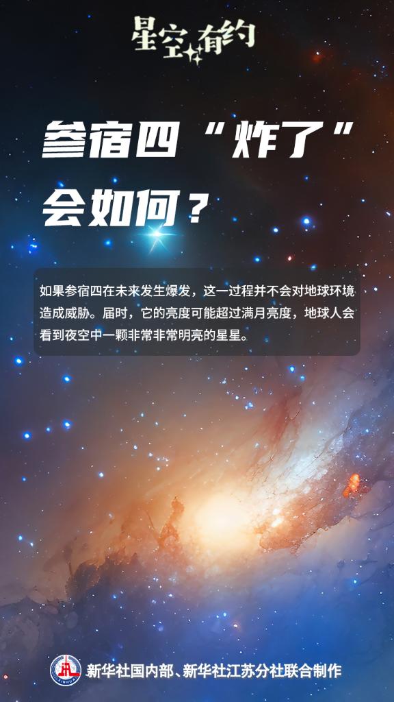 即便參宿四在未來真炸了,公眾也不必擔心。王科超表示,因為參宿四距離地球約600光年,并不會對地球環境造成威脅。屆時,它的亮度可能超過滿月亮度,地球人會看到夜空中一顆非常非常明亮的星星。