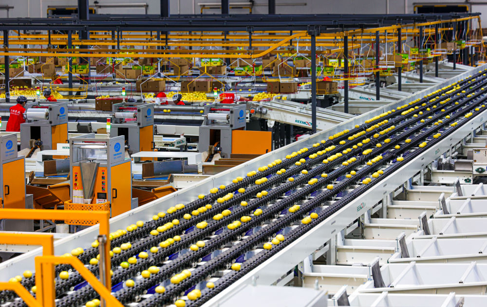 四川省維記農業集團有限公司車間內,多功能六通道智能分選機在分揀檸檬。(吳忠坤 攝)