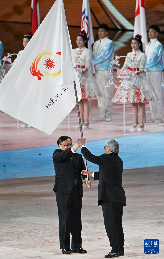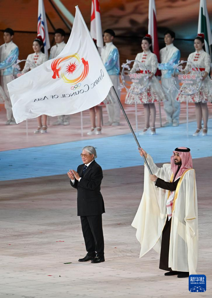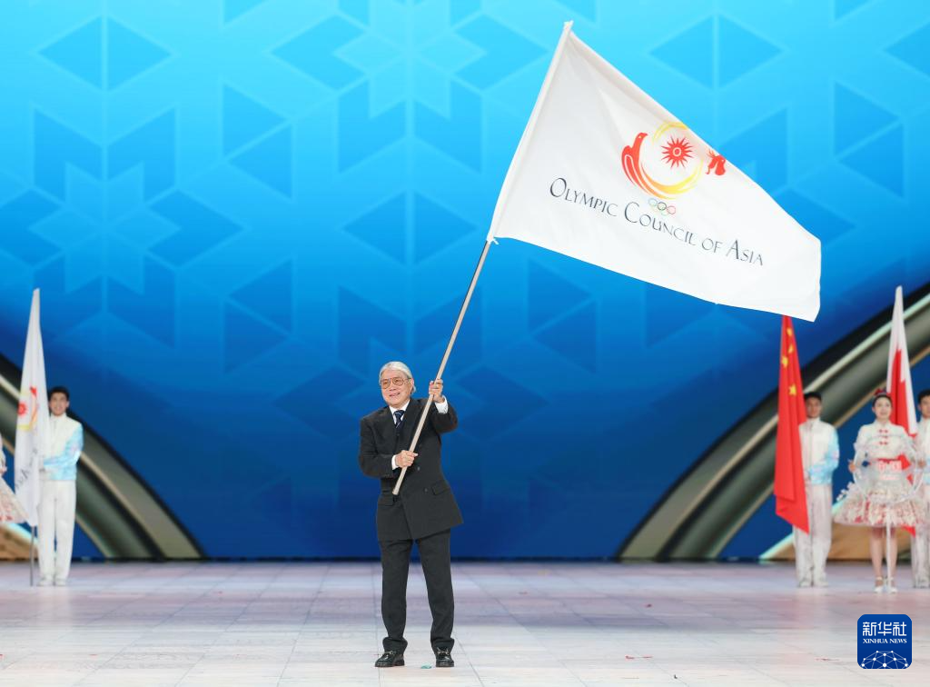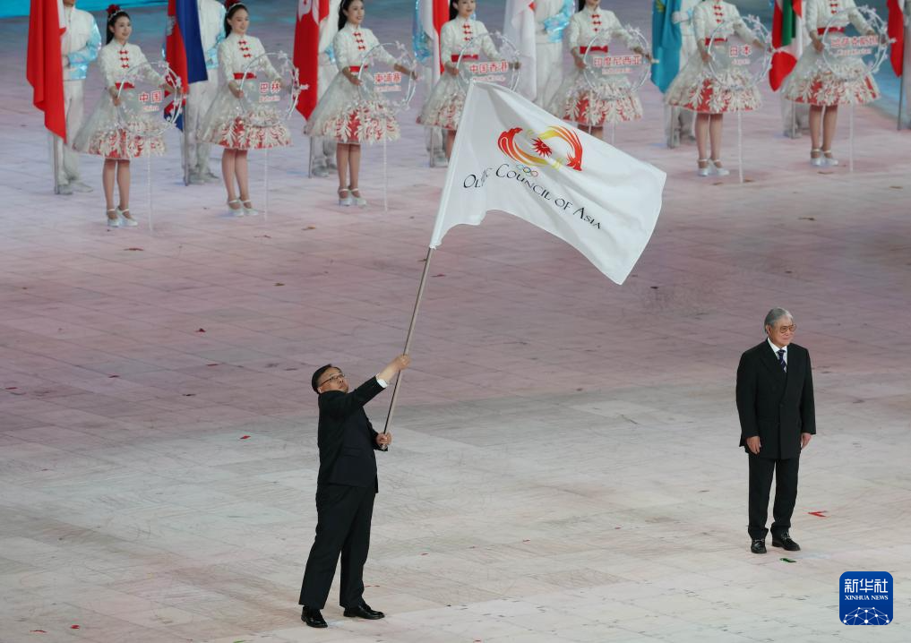 這是2月14日在閉幕式上拍攝的亞奧理事會會旗交接儀式。