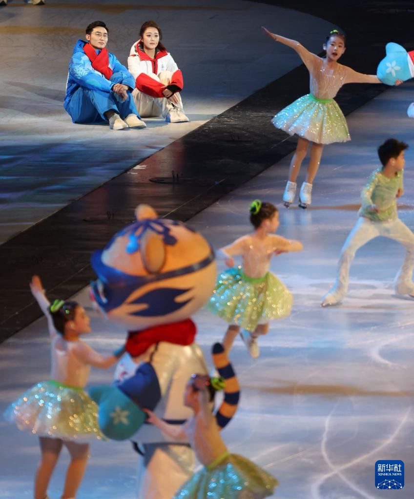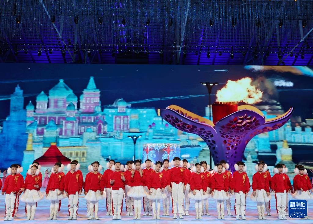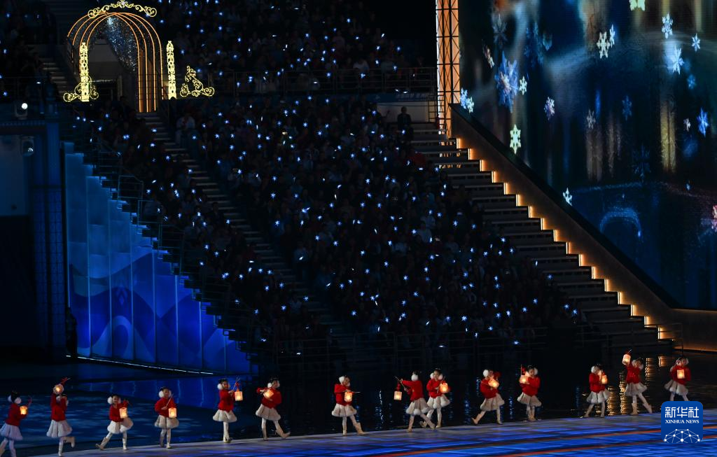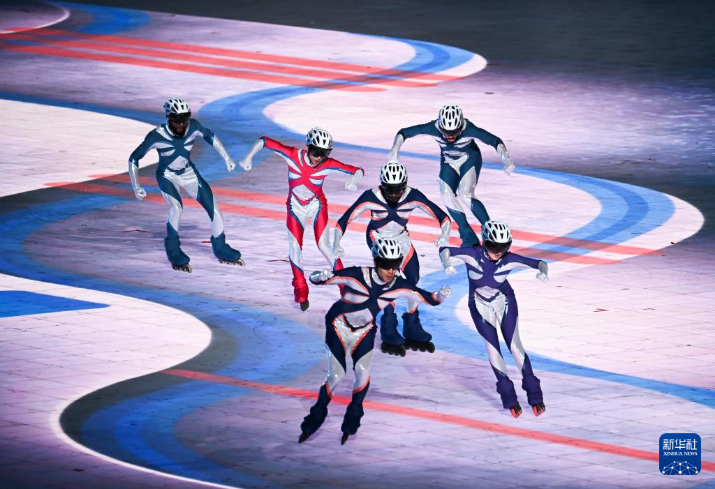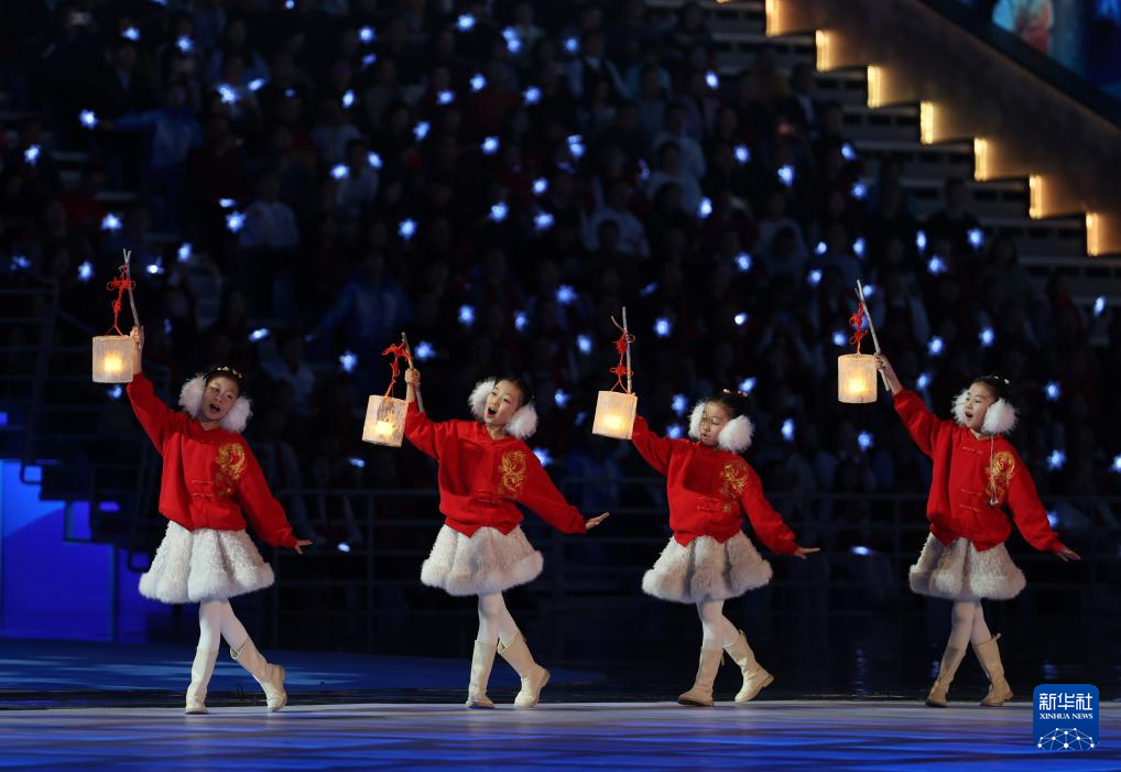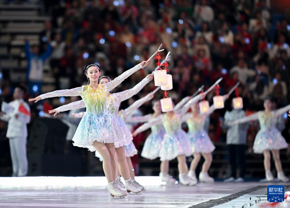 這是2月14日在閉幕式上拍攝的下一屆亞冬會主辦城市帶來的展演。